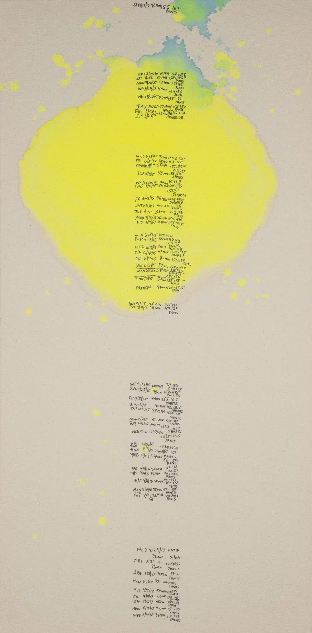 Self Talk (should stop being so intense) 2024 Acrylic and embroidery on raw canvas 48x24”